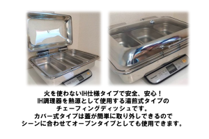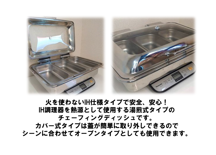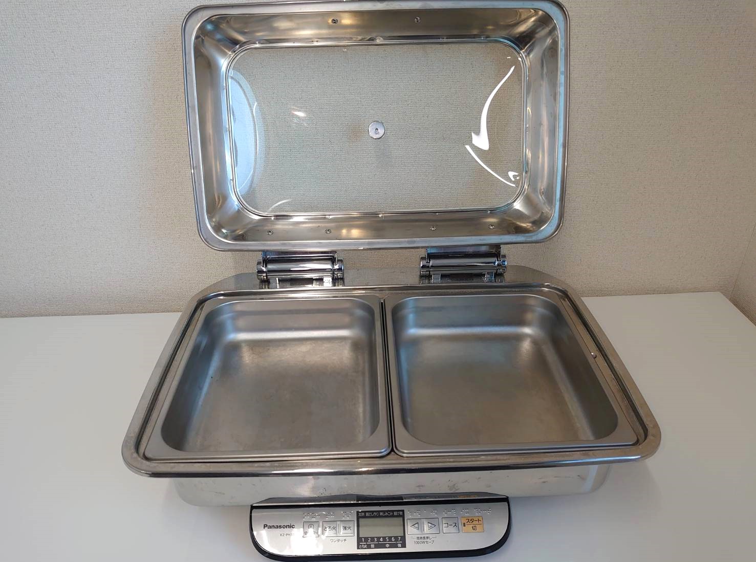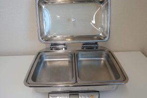 ・ステンレス製チェーフィングディッシュ(サイズ40㎝×55㎝×9㎝)3台(仕切り容器 大8・小6)